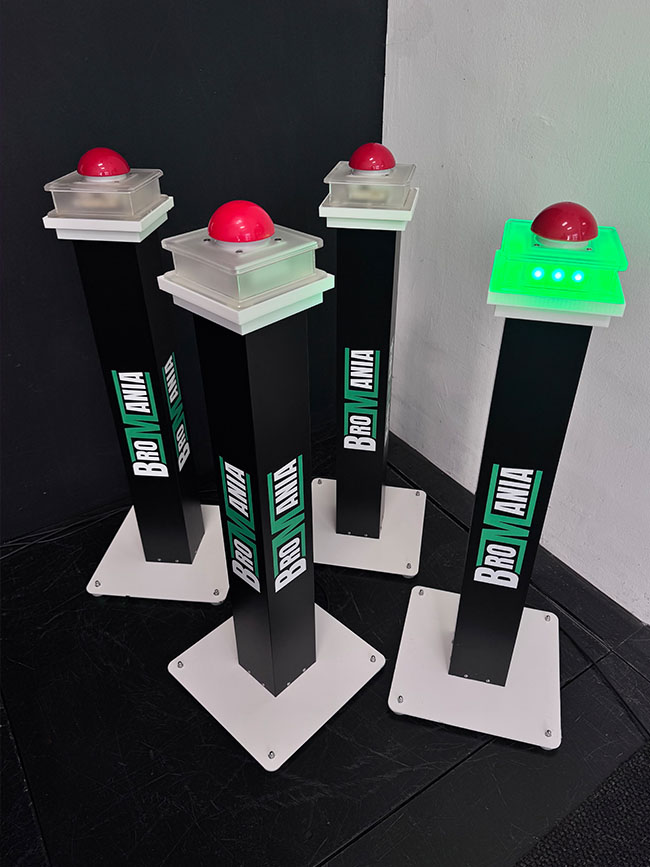 Individualisieren Sie die Anlage: Wählen Sie die Farbe, in der die LEDs leuchten, wenn der Buzzer gedrückt wird. Auf Wunsch folieren wir auch die Säulen nach Ihren Vorgaben.