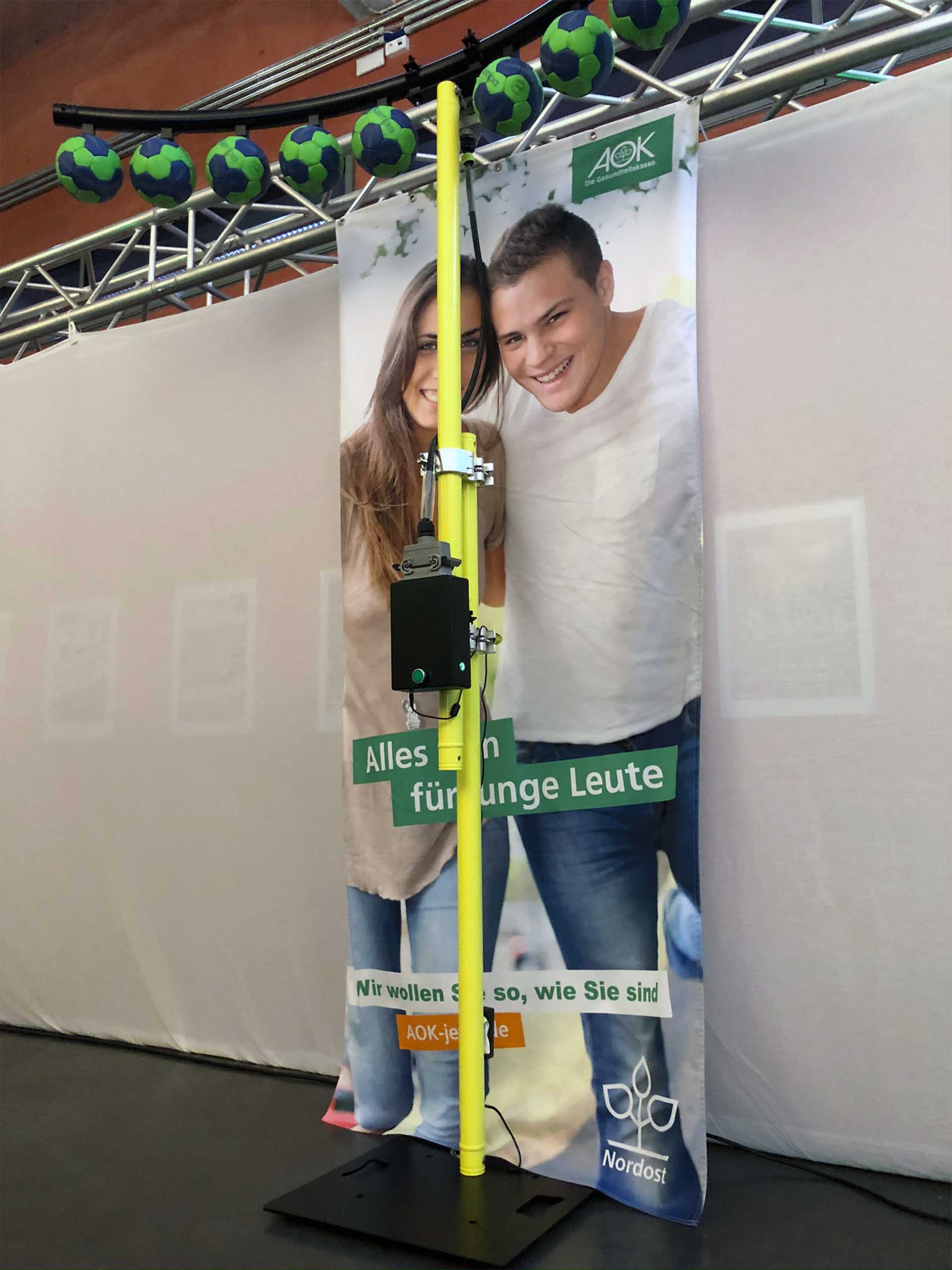 Für die AOK ist unsere Entwicklung im Rahmen der Heimspiele des Handball-Erstligisten Füchse Berlin in der Max-Schmeling-Halle im Einsatz. Hier müssen nicht Stäbe sondern Handbälle gefangen werden.