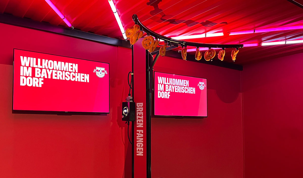 Auf Wunsch integrieren wir auch andere Gegenstände oder Produkte. Hier die Spielidee „Fischkopp fangen“ beim Bundesligaspiel RB Leipzig gegen Werder Bremen.